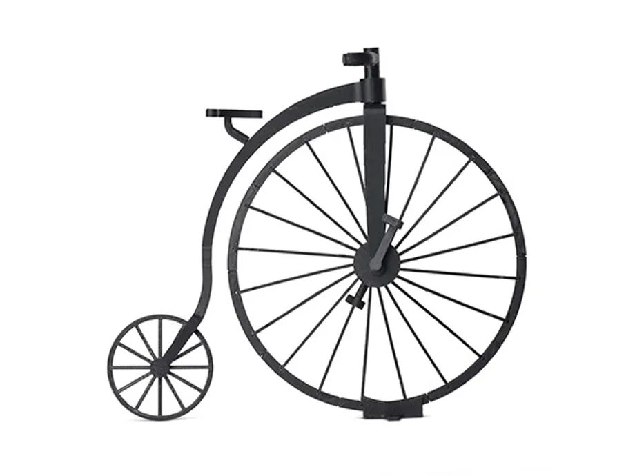 This is a 3D print, made by RYDA Technology, of a penny-farthing bicycle , also known as a high wheel, high wheeler and ordinary. It is a bicycle type with a large front wheel and much smaller rear wheel. It was popular after the boneshaker until the development of the safety bicycle in the 1880s.