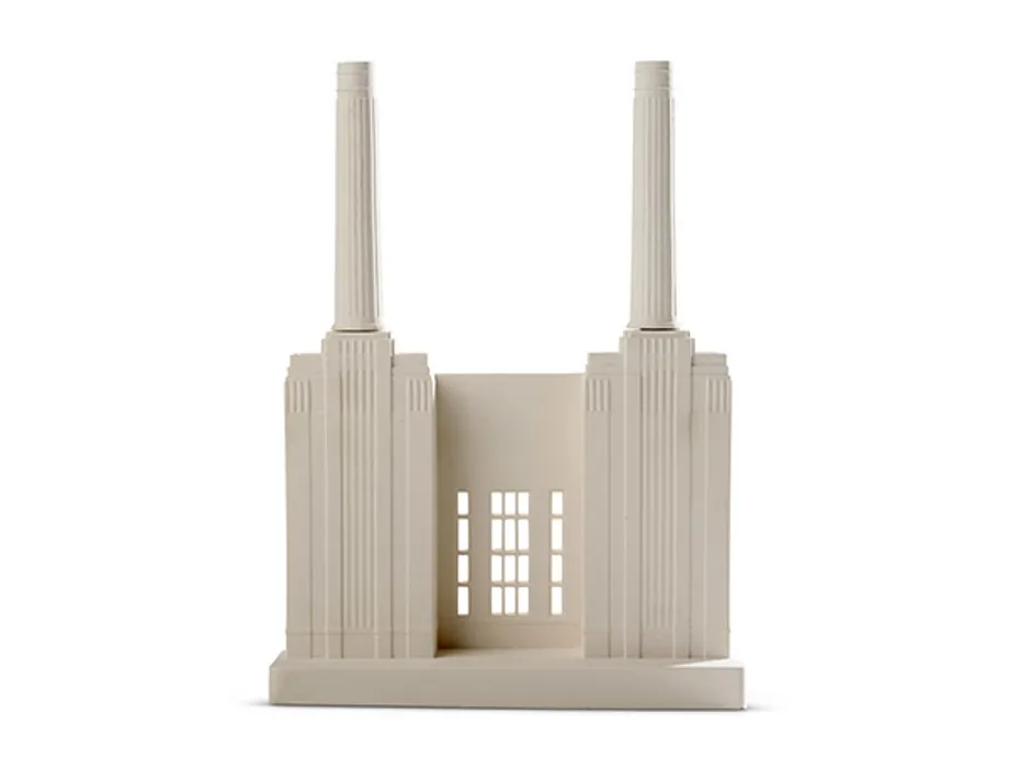 This plaster architectural sculpture of Battersea Power Station's northern chimneys is made by the firm Chisel & Mouse. Battersea power station was built in 1933 in Art Deco style and its exterior was designed by the architect Sir Gilbert Scott. Battersea Power Station is a decommissioned coal-fired power station. It comprises two individual power stations, built in two stages.