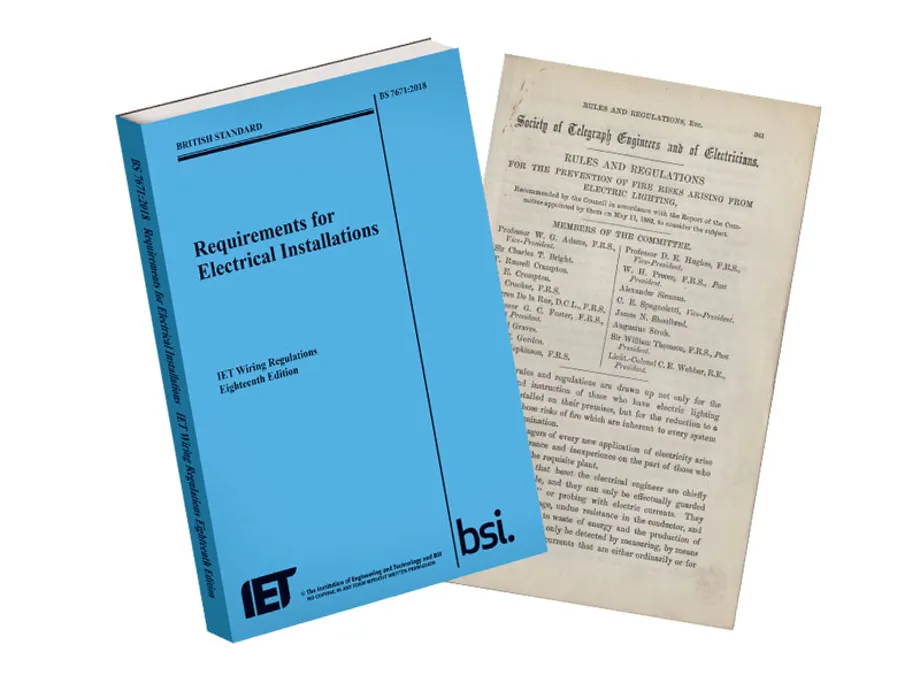 The first edition was published in 1882 as part of the Journal of the Society of Telegraph Engineers and of Electricians. The regulations were then titled, rules and regulations for the prevention of fire risks arising from electric lighting.