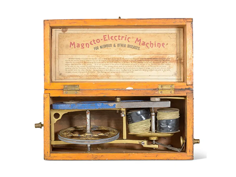 This equipment for giving mild electric shocks (unknown manufacturer) was probably produced in Great Britain in the 2nd half of the 19th century. Mild electric shocks were a popular treatment for aches and pains in the 19th century, particularly, those that were associated with nerves.