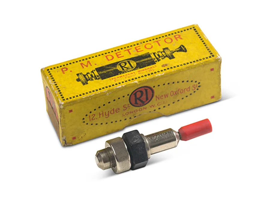 The item displayed is a permanent mineral detector, a device used to permanently place a 'whisker' in a crystal radio set upon the crystal.