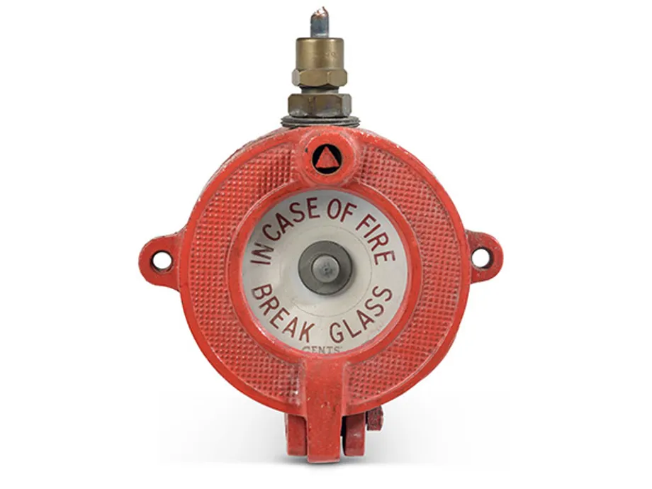 This factory fire alarm does not detect a fire itself but relies on an individual to spot a fire or the signs of a fire and then trigger the alarm by breaking the glass and pressing a button.