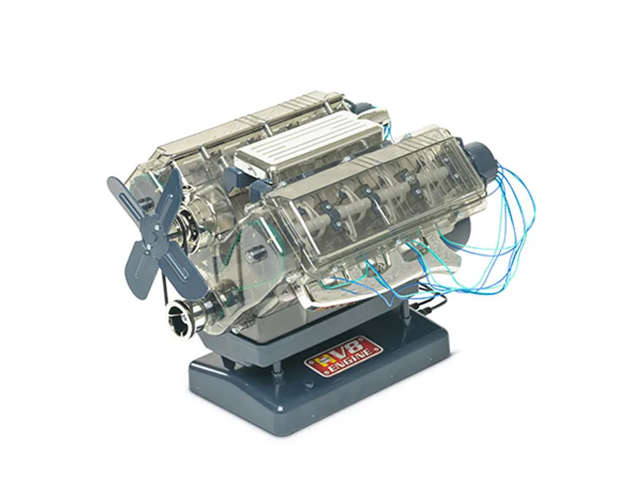 This is an assembled model of a V8 car engine, originally supplied in kit form made by Haynes. This is a working model but it is not meant to represent the V8 engine of a particular car.