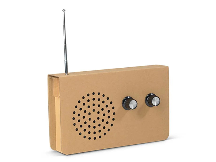 This is a Science Museum battery powered FM radio and MP3 speaker with recycled cardboard exterior.