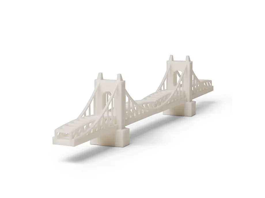 This is a 3D print of a suspension bridge. The first permanent wire cable suspension bridge was Guillaume Henri Dufours Saint Antoine Bridge in Geneva, Switzerland, built in 1823 with two 40m spans.