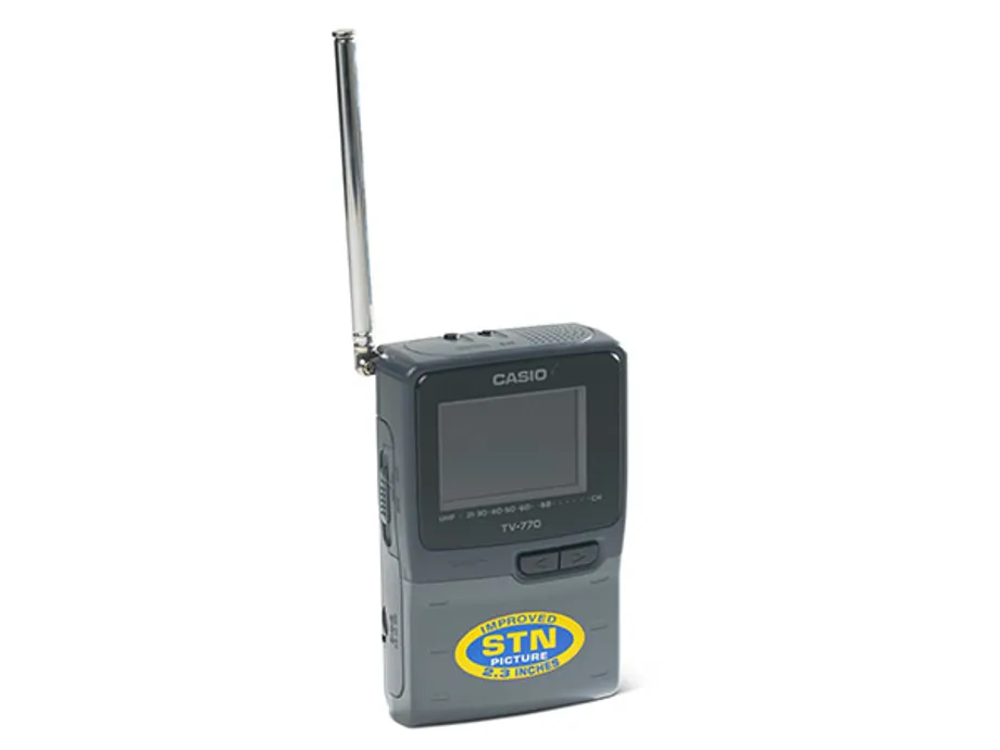This is a Casio portable handheld analog television, model 770D, circa 2000. Early mobile television receivers were based on the old analog television signal system and were the earliest televisions that could be placed in a coat pocket. The first was the Panasonic IC TV MODEL TR-001, introduced in 1970.