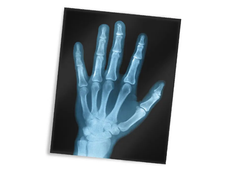 This image, or radiograph, is a modern X-ray of a hand. One of the first X-ray photographs was made of the hand of Röntgen's wife.