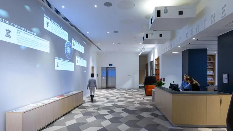 Within the lobby space of the Faraday Centre on the 2nd floor is a live digital display showing up-to-the-minute information from the global world of the IET.
