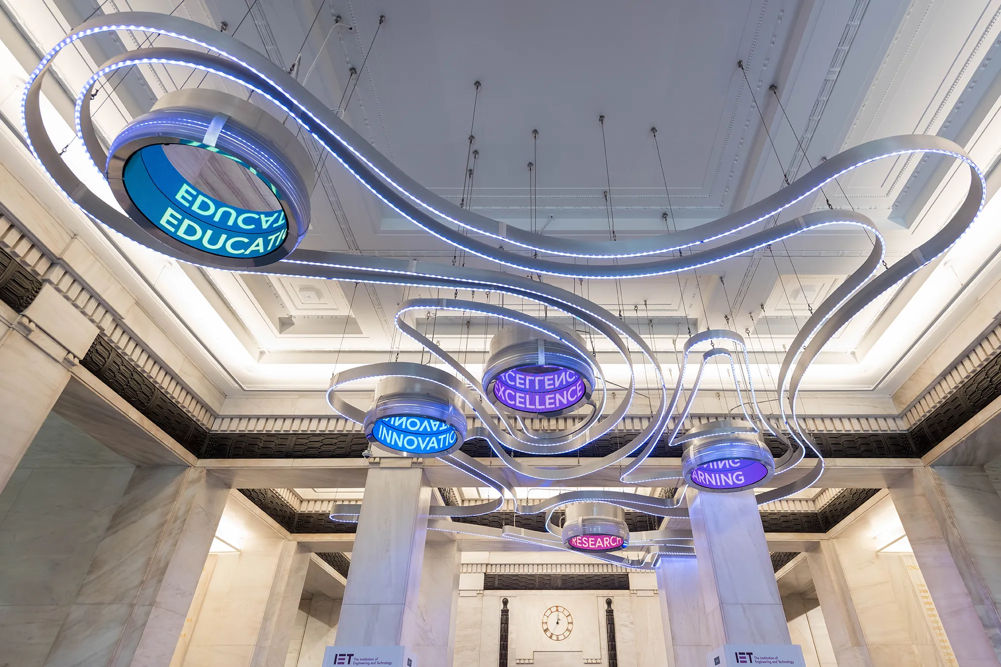 On entering IET London: Savoy Place an elegant and interactive digital chandelier sets the tone.