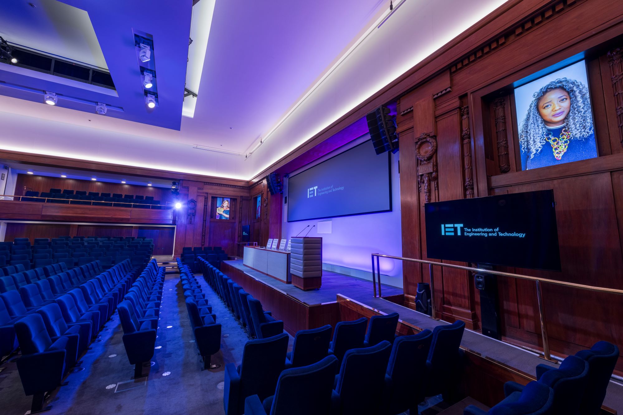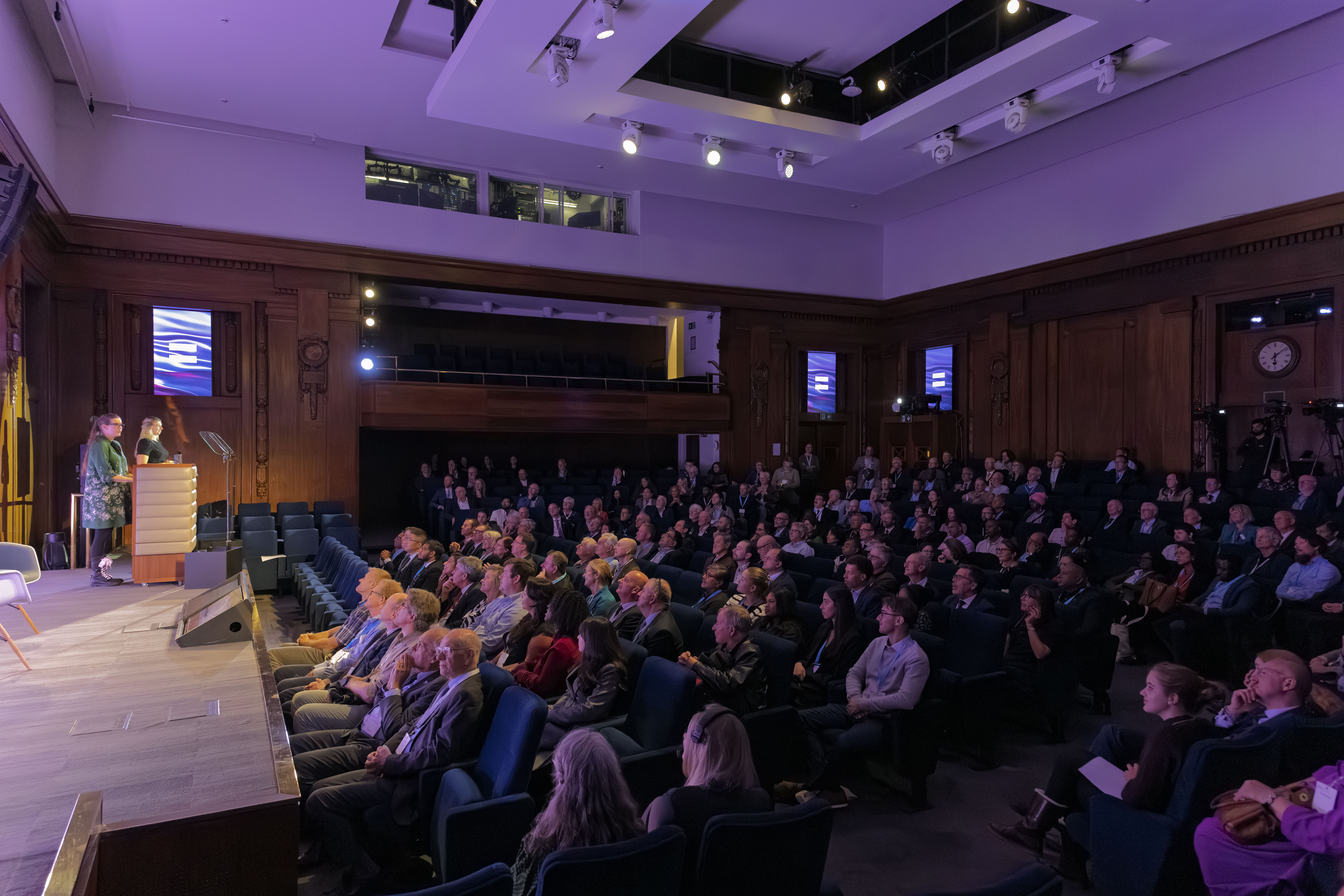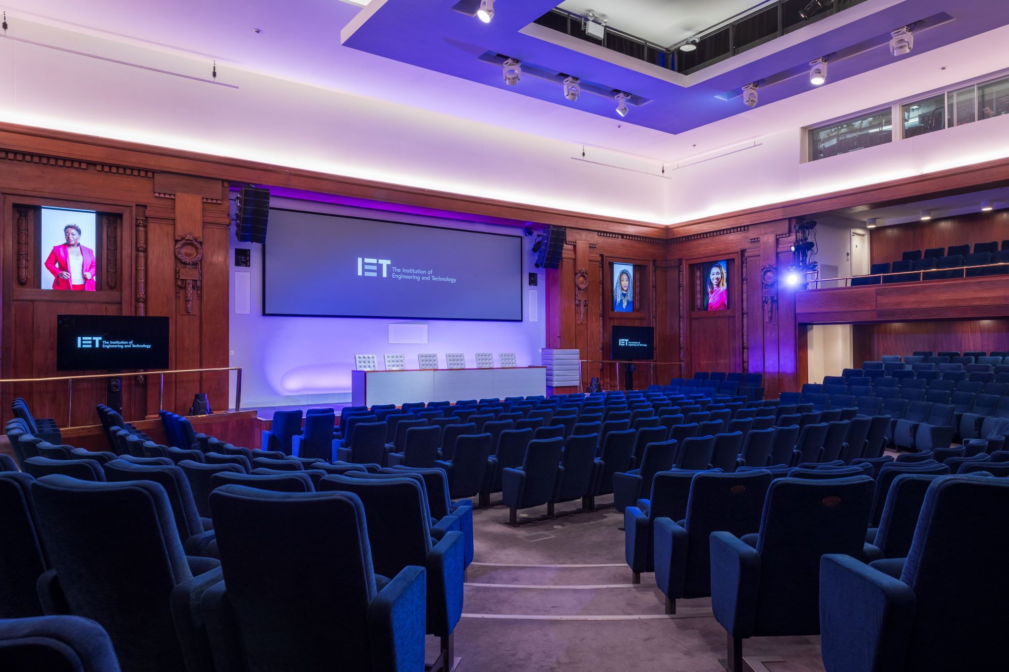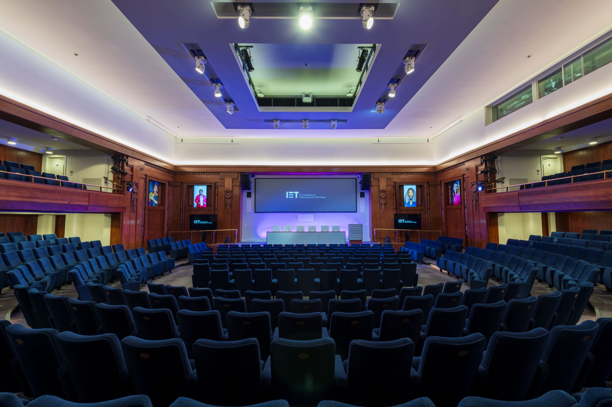 Hosting up to 451 people in tiered seating, the lecture theatre comes with 391 ground level seats and a further 30 on each of the two balconies, also accommodating up to nine speakers on stage.