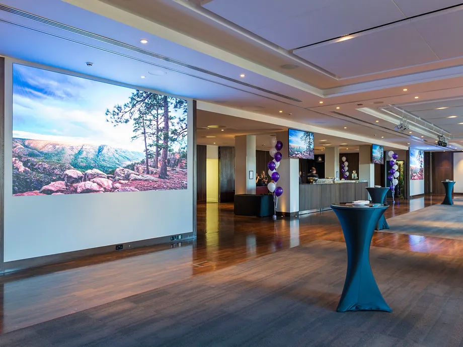 - 2 x 98-inch HD content screens at the far ends of the room with optional 2 x 75-inch HD pillar-mounted screens *